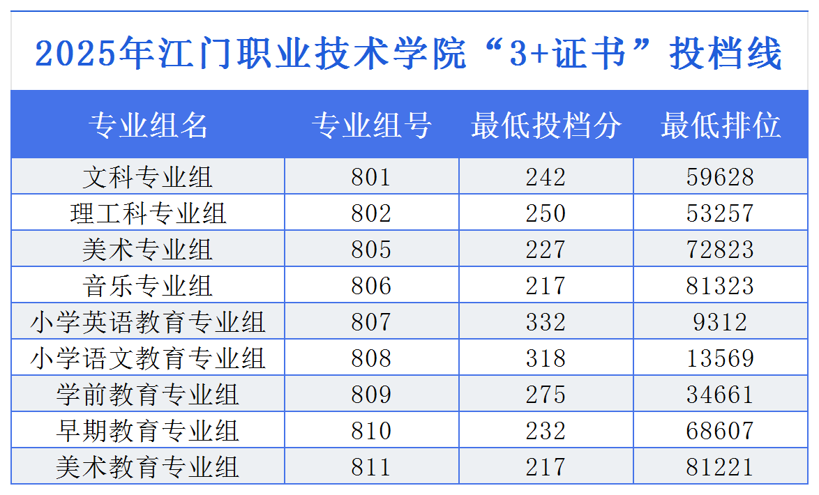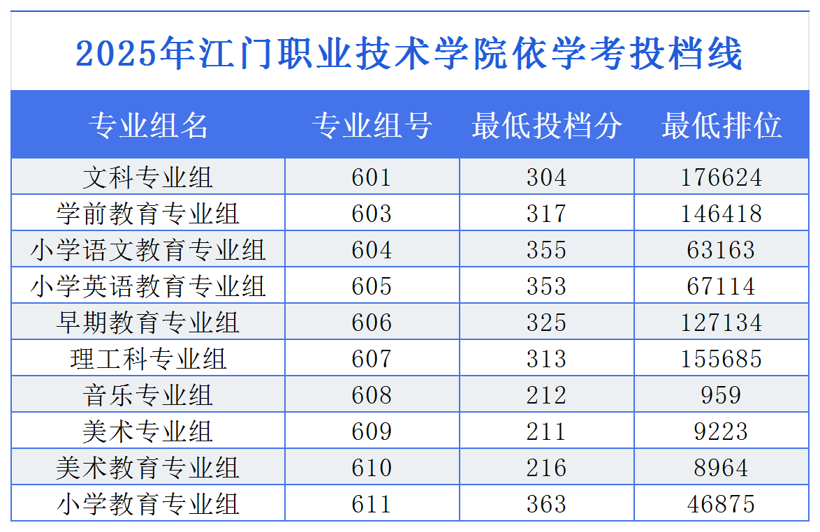 导读:2025年江门职业技术学院“3+证书”(中职生)投档分最低的专业组为音乐专业组和美术教育专业组,该组投档最低投档线217分;依学考普通类专业录取投档分最低的专业组为文科专业组,该组投档最低排位176624。