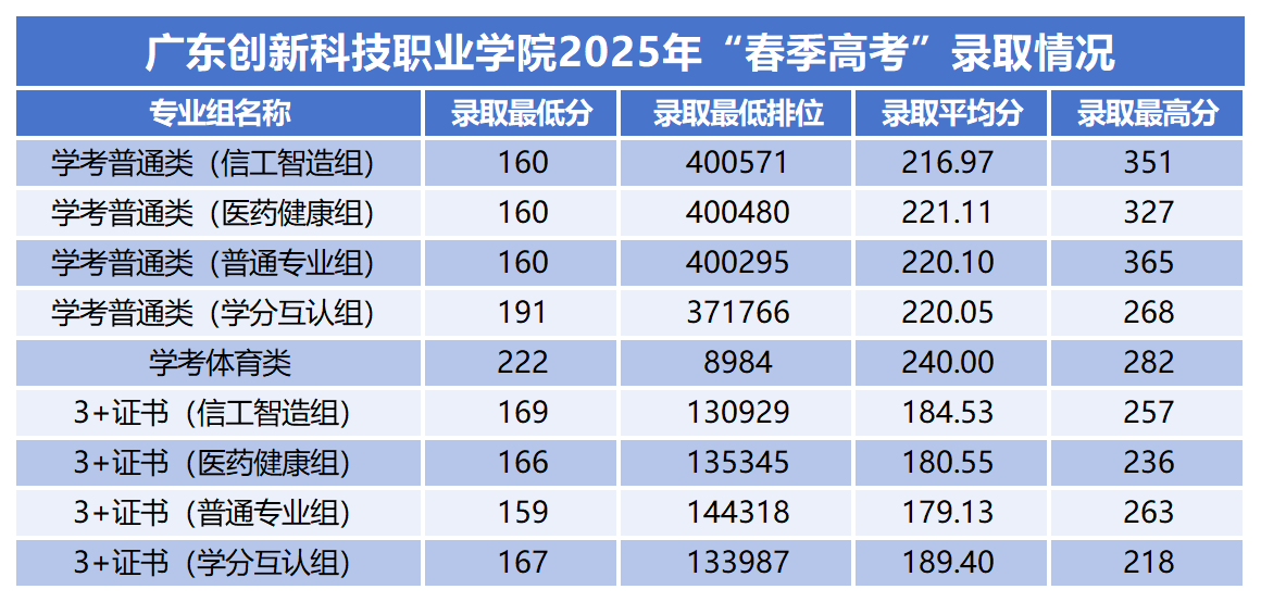 以上就是“ 2025年广东创新科技职业学院3+证书(高职高考)录取分数线 ”的全部内容,更多关于广东3+证书的相关内容,如广东3+证书准考证打印、报考条件、招生计划、报名时间、考试科目、广东3+证书成绩查询、分数线等敬请关注广东高职高招网http://www.gdgzgz.cn