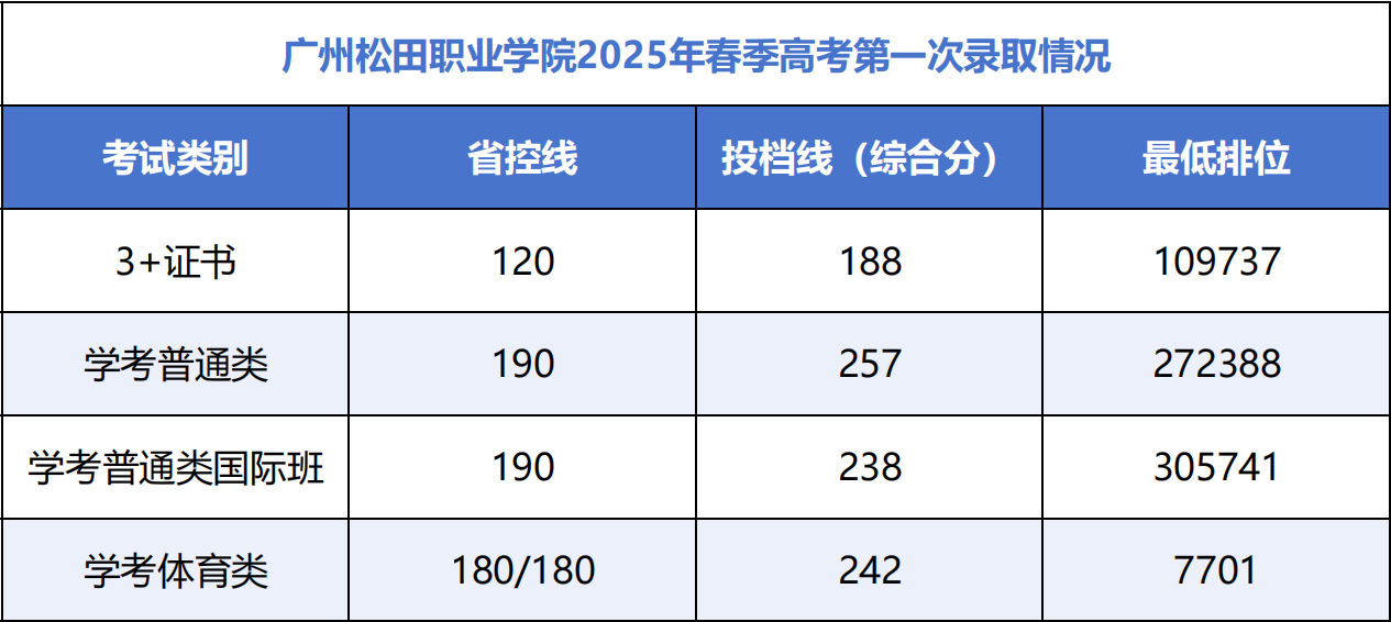 2025年广州松田职业学院3+证书(高职高考)和学考各类投档情况如下:想了解更多,可以咨询我们的【在线老师】